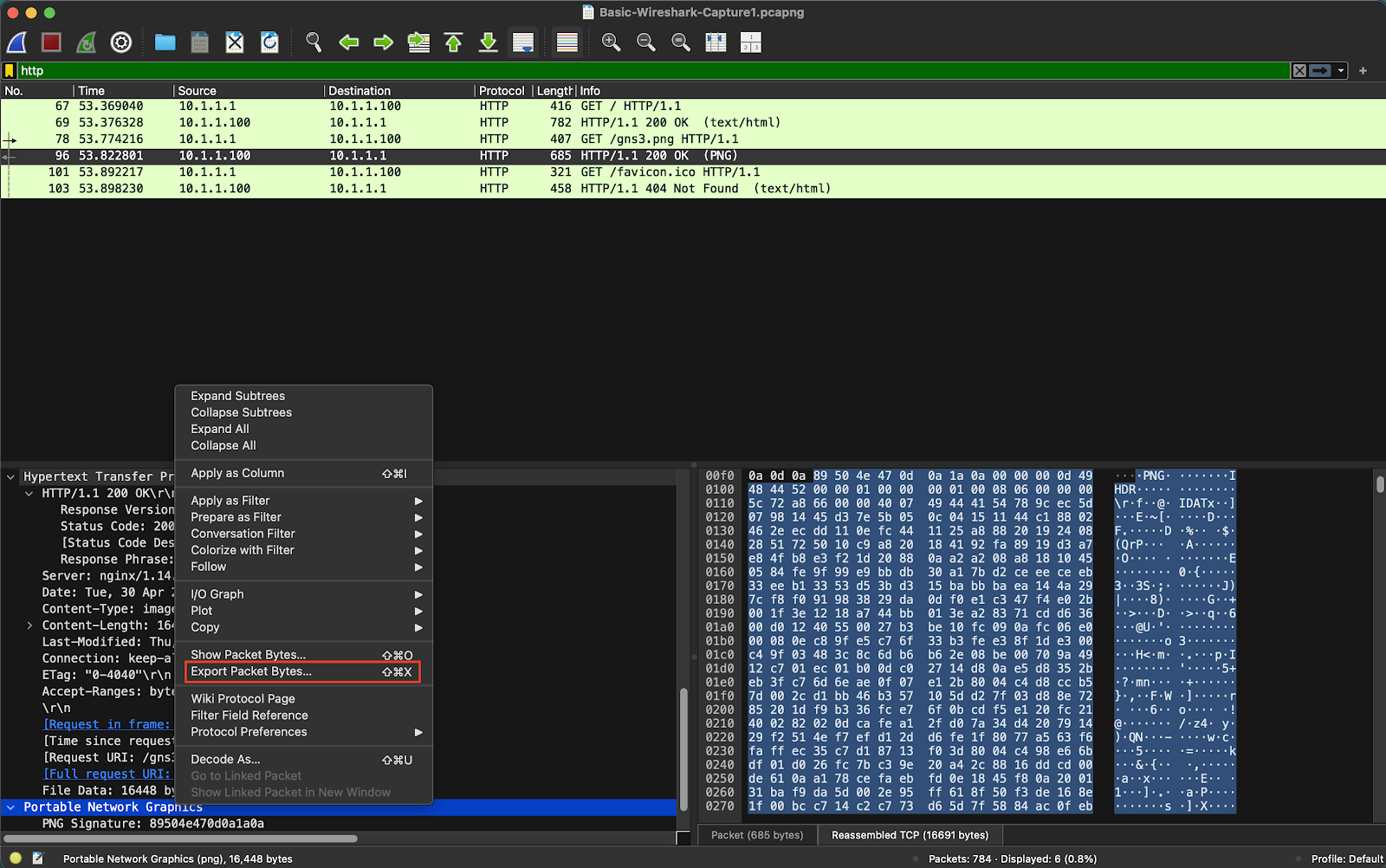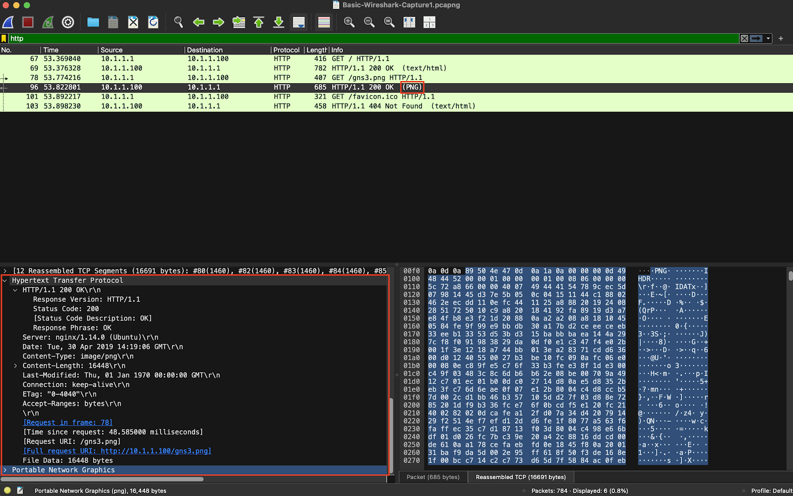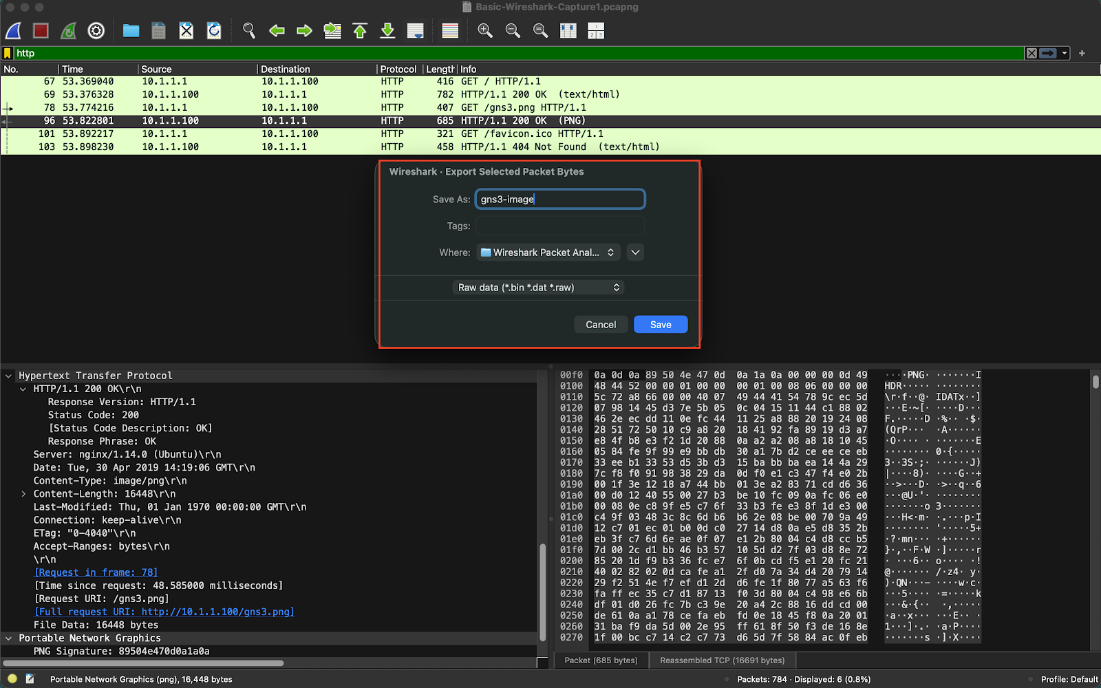 GET /gns3.png HTTP/1.1를 서버측에서 응답하는 패킷HTTP/1.1 200 OK (PNG)을 분석하여 PNG 파일을 내 Local에 다운로드 받기