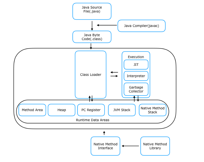 Java로 작성된 프로그램은 일련의 과정을 거칩니다. 소스 코드가 실행되면 JVM을 통해 해당 OS에 도달하기 때문에 OS에서 인식 가능한 기계어로 바로 컴파일 되는 것이 아니라 위 그림과 같이Bytecode(.class)로 컴파일 됩니다.
